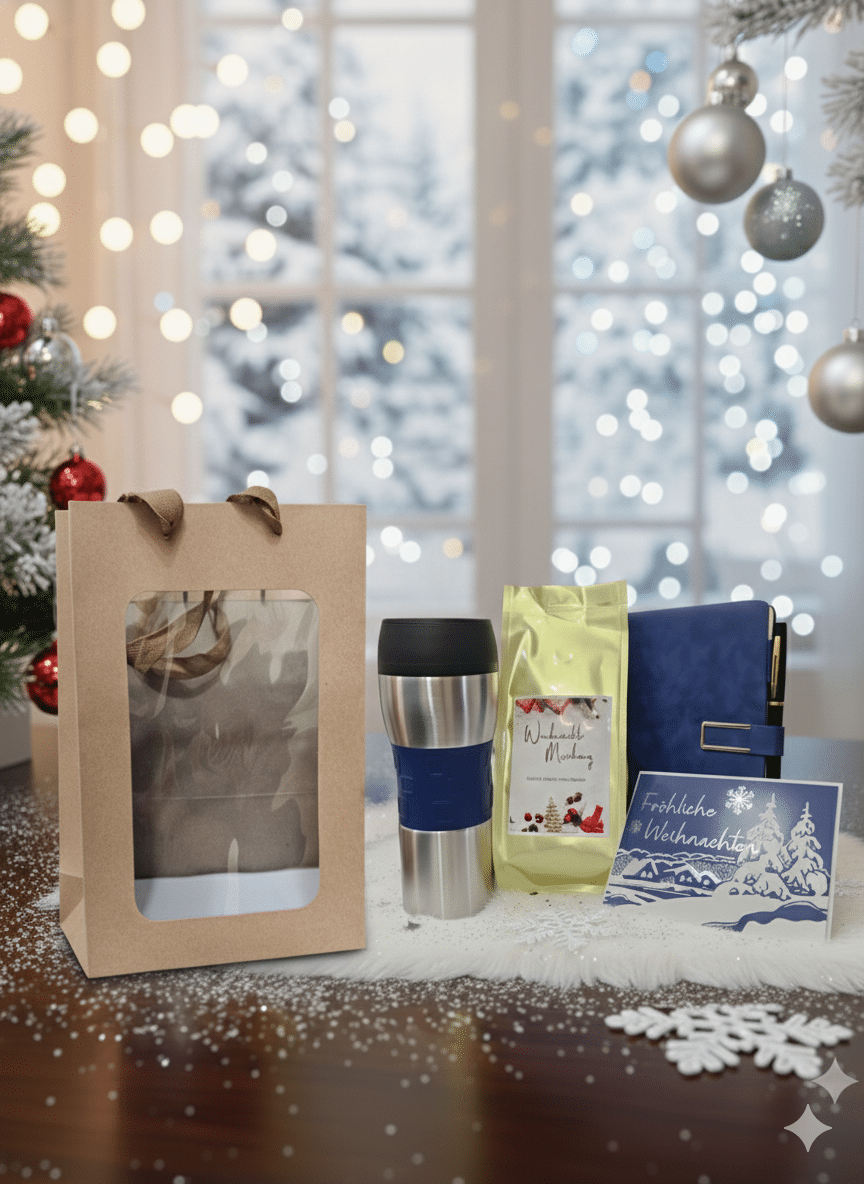 Weihnachts Geschenkset Office – 400 ml Thermobecher doppelwandig, Notizheft A6 mit Stift, 250 g Weihnachtskaffee (ger...